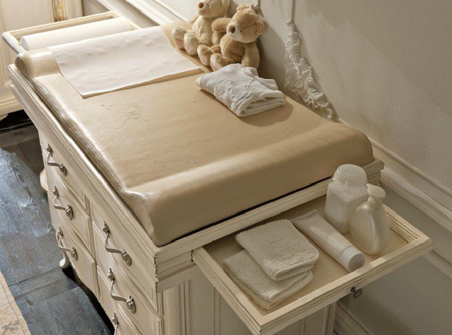 Лучше отправьте на дачу кресло, стоящее без дела, или уберите компьютерный стол, но эту мебель обязательно установите - она станет бесценным помощником в деле по уходу за ребенком. На столике очень удобно пеленать и одевать ребенка, совершать гигиенические процедуры, имея все необходимое под рукой, здесь же можно будет без опаски расположить кроху для принятия воздушных ванн и для массажа. Его не заменит ни кровать, ни обеденный, ни письменный стол по ряду понятных причин: первый предмет мебели - превращает молодую мать в человека с вечно болящей спиной, второй и третий - не снабжен бортиками и удобными отделениями для принадлежностей, необходимых для ребенка.