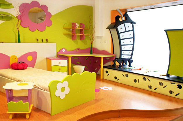 Разнообразьте интерьер веселым ковриком с оригинальным рисунком, используйте обои со сказочными пейзажами и персонажами.