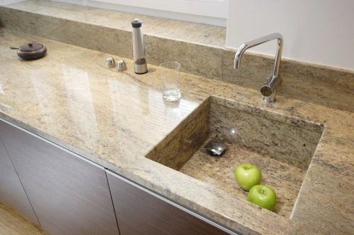 Искусственный камень обладает гладкой поверхностью, которая не поглощает жидкости и не проникает внутрь материала. Это делает его устойчивым к пятнам от продуктов, жидкостей и масел. Столешницы из искусственного камня легко моются и чистятся обычными моющими средствами, что обеспечивает высокий уровень гигиеничности на вашей кухне.
