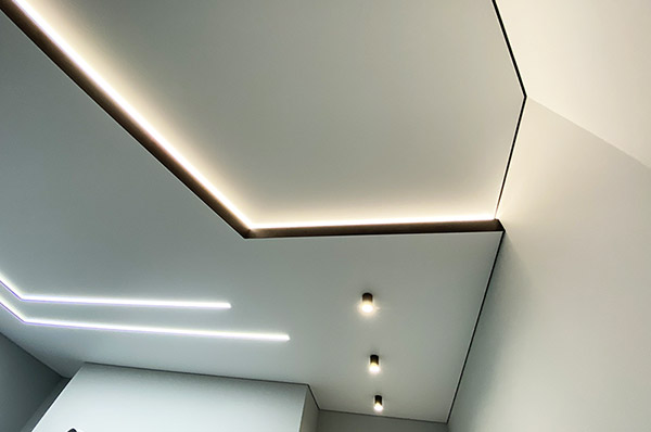 Теневой натяжной потолок идеально сочетается с различными видами освещения. Вы можете интегрировать в него точечные светильники или подсветку, что добавит пространству дополнительную яркость и эффектность.