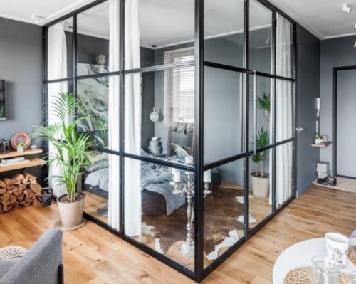 • В комнате будет создано ощущение полноценного зонирования. Однако при этом не происходит уменьшения площади, а также лишения пространства естественного освещения. В небольших помещениях уместны перегородки из стекла раздвижного типа, так как они дополнительно выполняют функции межкомнатной двери.