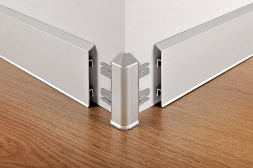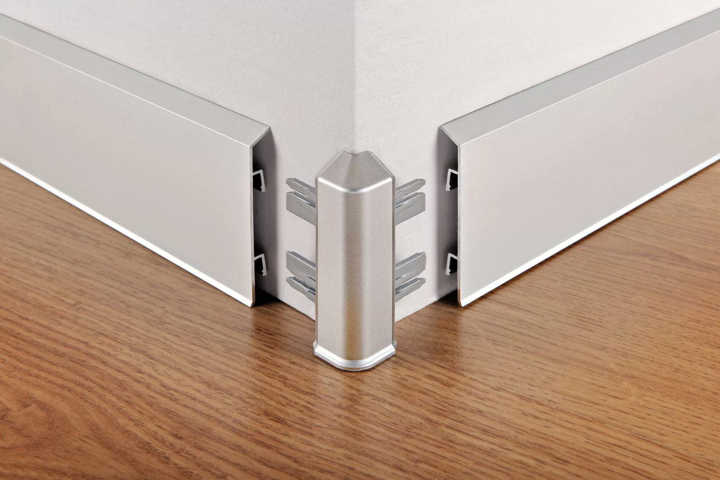 Удобство монтажа и ухода: Легкий в установке, алюминиевый плинтус также легко чистится. Его поверхность устойчива к пыли и грязи, что облегчает уход за полом.