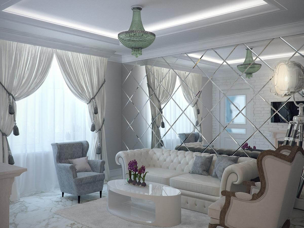 В современном интерьере зеркальная плитка чаще всего используется для создания эффекта зеркального отражения, который придает помещению больше света и пространства. Она отлично подходит для узких и малогабаритных помещений, так как визуально увеличивает их объем и делает их более светлыми.