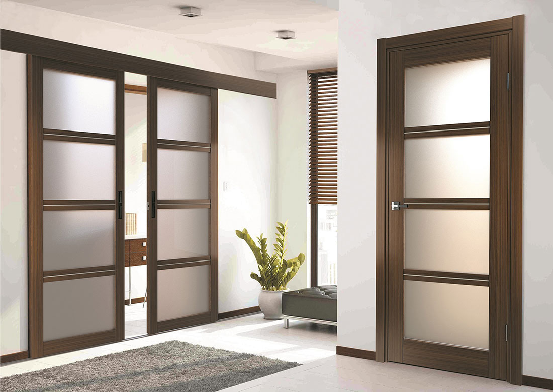 Стеклянные двери. Стекло в интерьере становится всё более популярным. Стеклянные двери могут быть прозрачными, матовыми или с узорным стеклом. Они позволяют визуально увеличить пространство и добавить свет в помещение. Однако такие двери требуют особого ухода и осторожности.