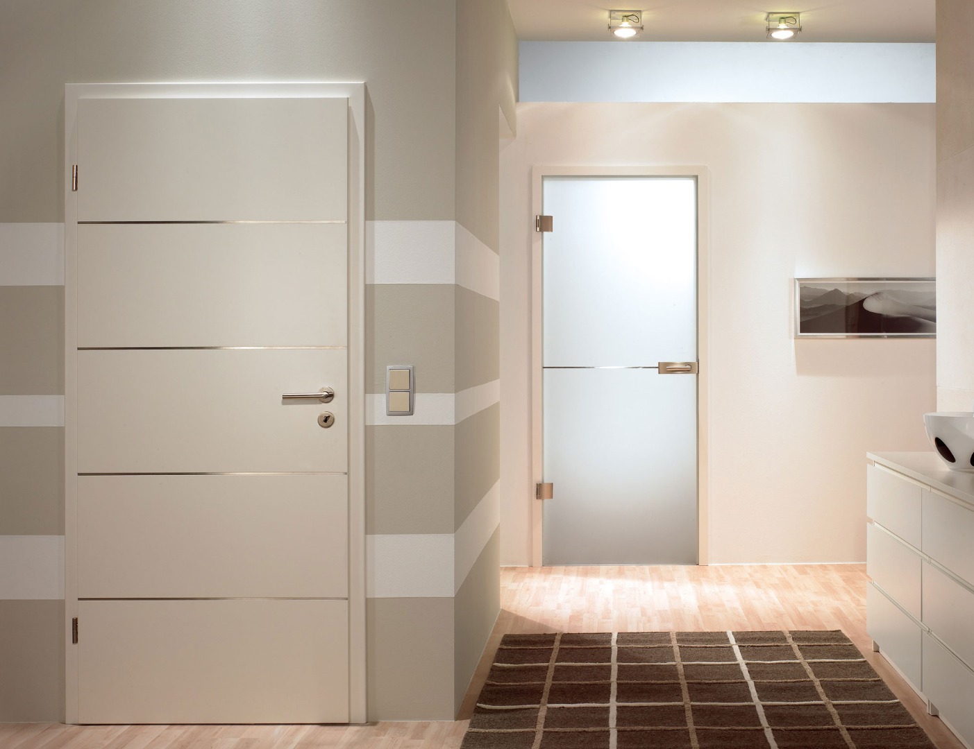 Стеклянные двери: Стекло придаёт помещению легкость и простор. Оптимальным вариантом будет матовое или закалённое стекло, которое защищает от случайного повреждения.