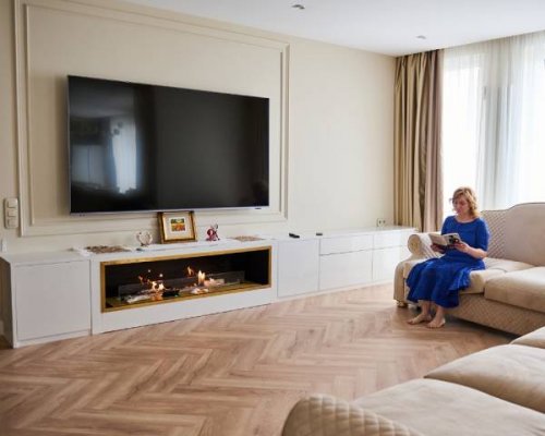 На фото биокамин ZEFIRE встроен в тумбу под ТВ: одно из самых популярных решений установки очага.