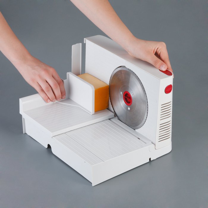 Прибор должен быть устойчивым, а не ползать по столешнице. Для устойчивости на дно ломтерезки клеят резинки.