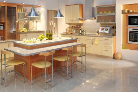 Можно сделать встроенные панели с выдвижными ящиками для кухонной утвари. Жарочный шкаф разумнее располагать на уровне столешницы, холодильник встроить в пенал и в целом получится вполне комфортная укомплектованная кухонька. При таком планировании у хозяйки будет вполне достаточно свободного пространства для передвижения, а иногда даже достаточно будет протянуть руку, чтоб достать нужный инструмент. На стене, вдоль которой пойдет установка столов, поклейте декоративную керамическую плитку, часть стены можно выровнять шпатлевкой, окрасив ее в тон поверхности мебели. По желанию и финансовой возможности допустима отделка панелями, поклейка обоев. Для пола выбирайте линолеум, плитку в светлых тонах. Хорошим вариантом для вас будет Британская коллекция Керама Марацци, которая сделает вашу кухню более уютной. Обеденную зону можно выделить особой декоративной отделкой в виде плиточной мозаики. Так же не помешает встроенное дополнительное освещение над рабочими столами. Если для экономии пространства предпочтете откидной стол, то он должен естественно продолжать дизайн кухни по фактуре и цвету.