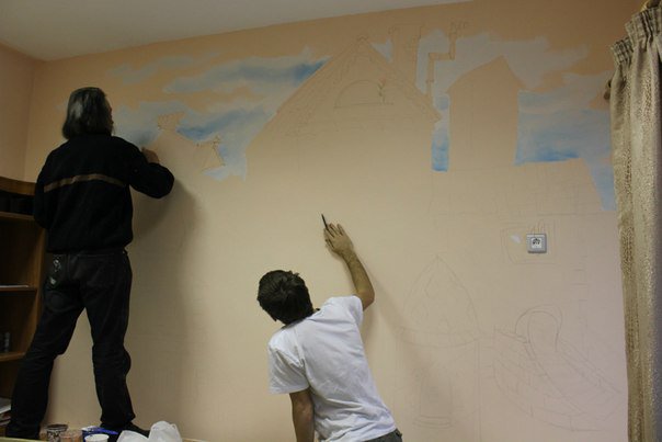 Наиболее подходящим вариантом для рисования будет чисто покрашена в однотонный светлый цвет стена. По ней удобно будет рисовать наброски, а после разукрашивать краской.