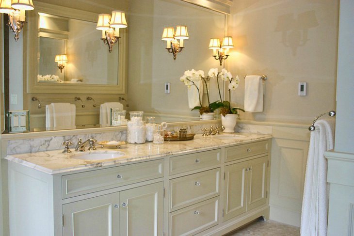 Подобные светильники нередко размещают возле зеркал. Нужно все сделать так, чтобы свет хорошо все освещал, но при этом никому не мешал.