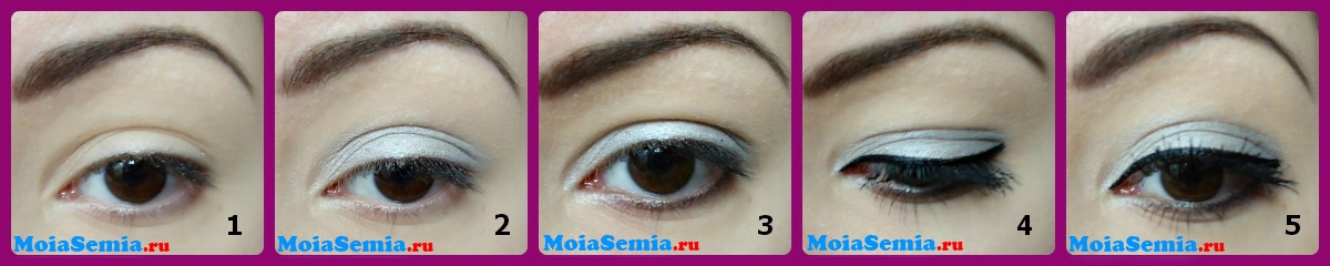 2. Теперь на верхнее веко наносим равномерно тени светлого, почти белого оттенка. Можно выбрать любой другой оттенок, какой только пожелаете. Тут можно посмотреть какой оттенок теней подходит для вашего цвета глаз: Макияж дневной.