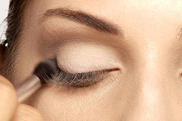 2. На верхнее веко наносим базовый тон теней, от внутреннего угла глаза, до внешнего.