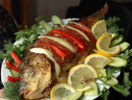 Можно приготовить крупного сазана на решетке с фруктами. Рыбу нужно очистить от внутренностей и промыть. Чешую снимать не нужно. Делаем с внутренней стороны косые насечки, аккуратно, чтобы не испортить кожу, и изнутри посыпаем солью. Оставим рыбу на час. Потом стряхиваем лишнюю соль, внутрь рыбы кладем яблоки, виноград, помидоры, лук. Ложим рыбу на решетку и на тлеющие угли. Примерно через 1 час рыба будет готова. Для гарнира на вертел или шампуры нанизываем очищенные баклажаны, кабачки, помидоры и жарим над раскаленными углями.