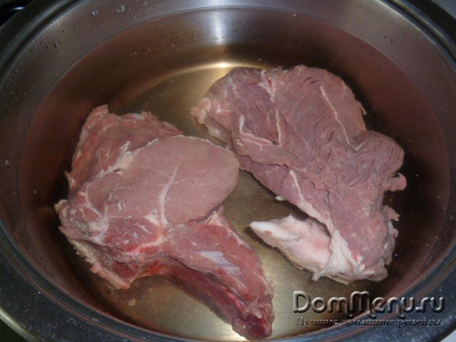 В первую очередь нужно помыть мясо и, залив 2,5 литрами воды, довести до кипения. После этого уменьшить огонь, накрыть крышкой и оставить вариться на два часа.