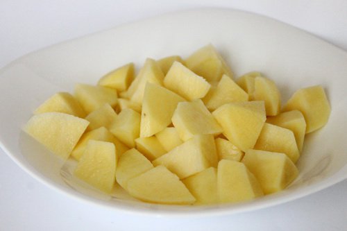 Тем временем нужно помыть и начистить картошку, после чего нарезать ее кубиками. После того, как мясо будет сварено, его нужно будет вынуть и процедить с него бульон, в котором позже поставить варить картофель.