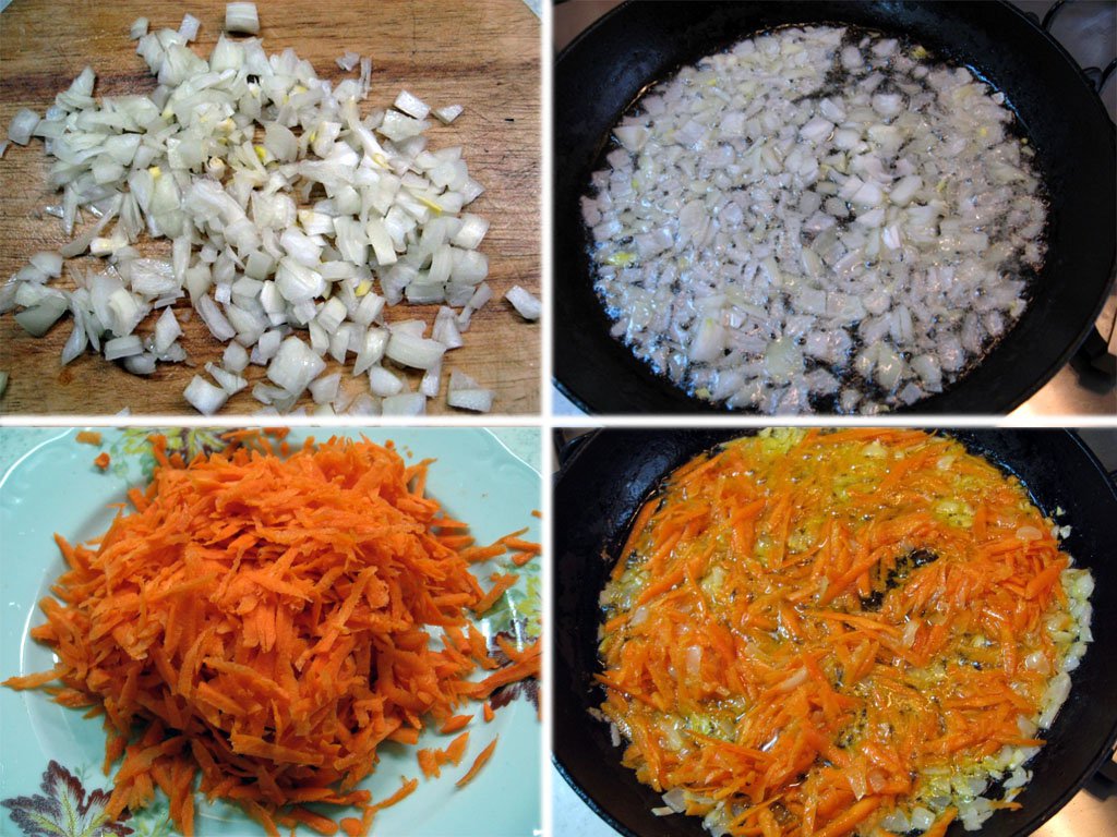 Пока картофель варится, переходим к зажарке. Для этого нужно помыть морковь и лук. Морковь нужно натереть на крупную терку, а лук нарезать мелкими кубиками.