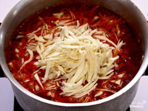 Добавляем овощи в кастрюлю к картофелю и после кипения добавляем мелко нашинкованную капусту. Варить капусту нужно 6-7 минут, после чего нарезать мелкими кусочками ранее варенное мясо и вернуть в кастрюлю к другим ингредиентам.