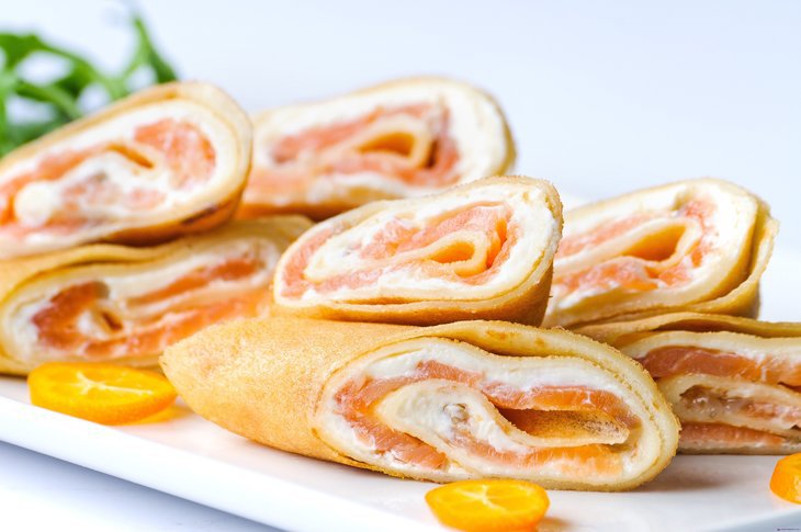 Подают такое блюдо с плавленым пастообразным сыром и зеленью. Также можно завернуть в них соленую творожную массу.