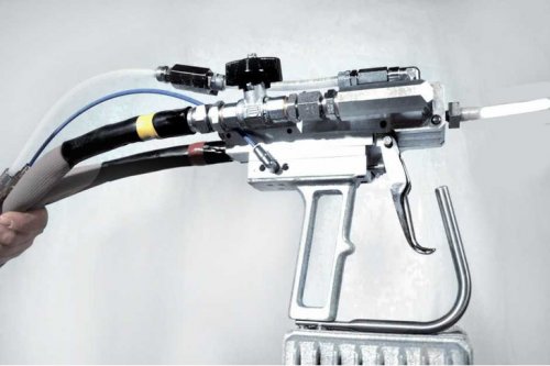 Распыление производится безвоздушным способом: посредством давления, которое создается самим аппаратом, без участия воздушных масс из компрессора. Воздух необходим для очистки и продувки камер от остатков материала.