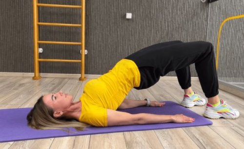 - На вдохе медленно поднимите таз вверх, напрягая ягодицы
