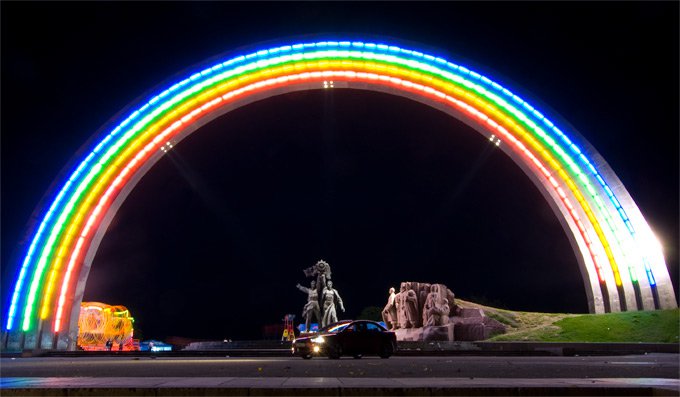 Возведена была она в Хрещатом парке (тогда еще называвшимся Пионерским) в ноябре 1982 года. Строение этой арки продолжалось целых четыре года. Скульптура, в первую очередь, посвящена тому дню, когда Украина воссоединилась с Россией. Аркой Дружбы народов мы называем не только саму, непосредственно, арку, но и еще две скульптуры, которые относятся к монументу: это двое трудящихся, которые сделаны из бронзы и сцена переяславской рады из гранита.