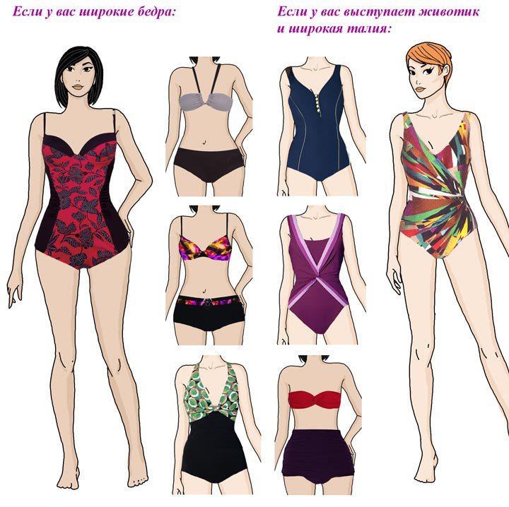 Избегайте также высоких вырезов в области бедер и моделей купальников с шортами.